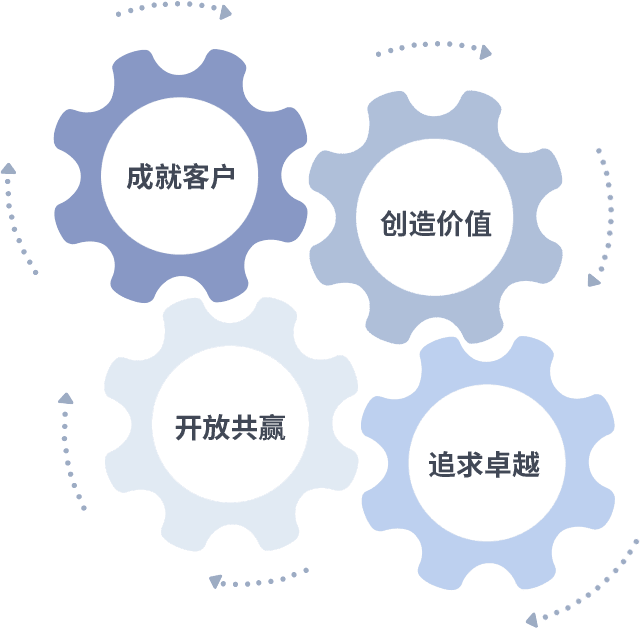 成就客户是一切决策的出发点,,创造价值是衡量所有工作的标准,,追求卓越是我们做事做人的态度,,,,开放共赢是我们的格局也是最终的结果。。价值观的齿轮环环相扣,,推动着组织里的每个人不断向前。。。