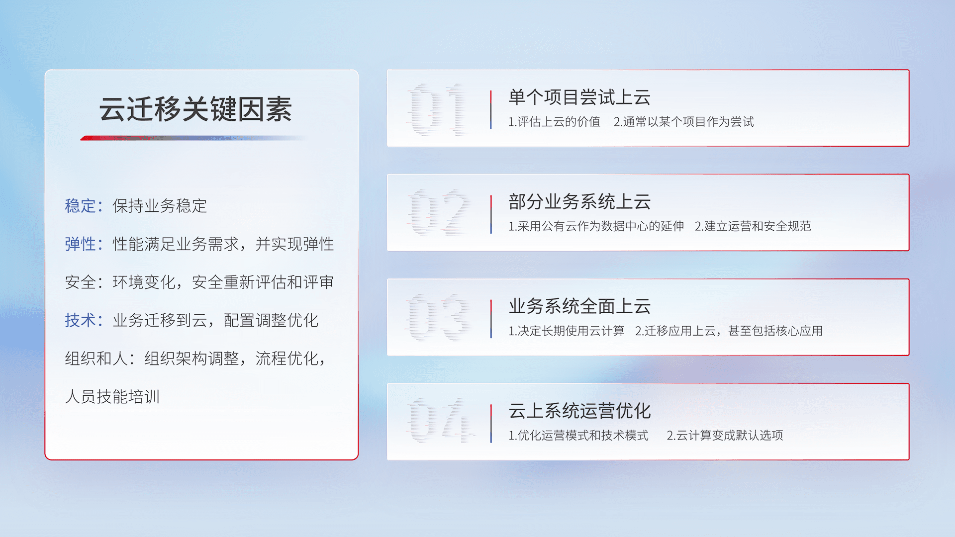 结合实际业务,,从规划设计、、云平台选型、、、云原生改造、、、、数据迁移、、集成交付,,,,迁移全过程为客户识别最佳上云路径,,,做好风险识别管理,,设计网络架构、、身份权限、、安全审计合规、、操作审计、、、日志审计、、监控告警策略、、、、多站点容灾设计等,,对云上基础设施进行整体规划,,提升IT治理水平,,以满足弹性、、、、高可用、、高性能的需求。。