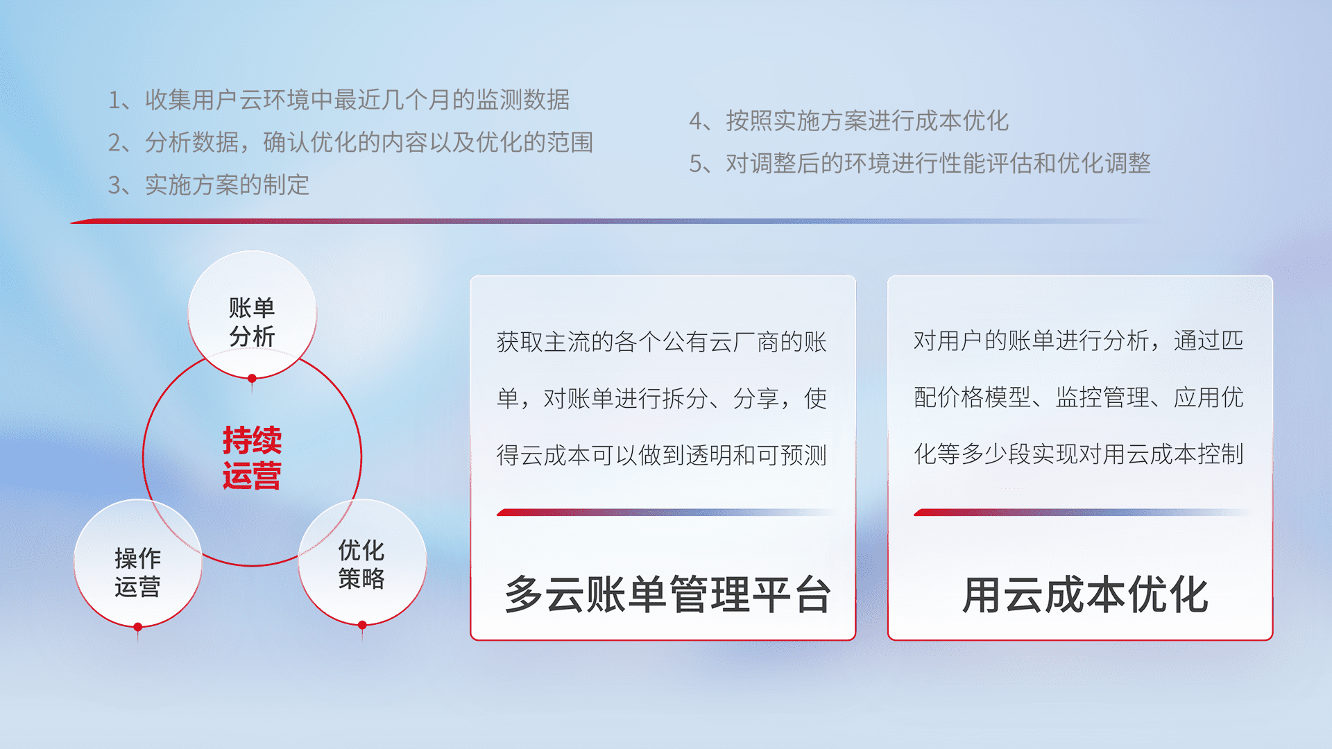 通过多云纳管,,,以统一的资源数据模型把客户的云资源进行抽象和封装,,进而实现对多云资源的统一操作,,保障云资源管理的可靠性、、、、稳定性与可用性。。。。量身定制化运维内容,,配置、、、、开发运维、、、、补丁管理、、备份、、、、监控、、、、认证和访问管理、、审计和日常巡检等,,,保障在用云过程中的可靠度,,,,稳定度以及高可用率。。。
